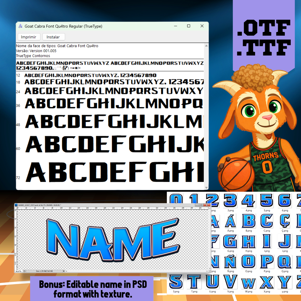 A Fonte GOAT: Cabras & Amigos foi criada para trazer força, atitude e estilo esportivo aos seus projetos. Inspirada no universo dinâmico e urbano dos animais jogadores de basquete, essa tipografia é perfeita para composições modernas, vibrantes e cheias de personalidade.