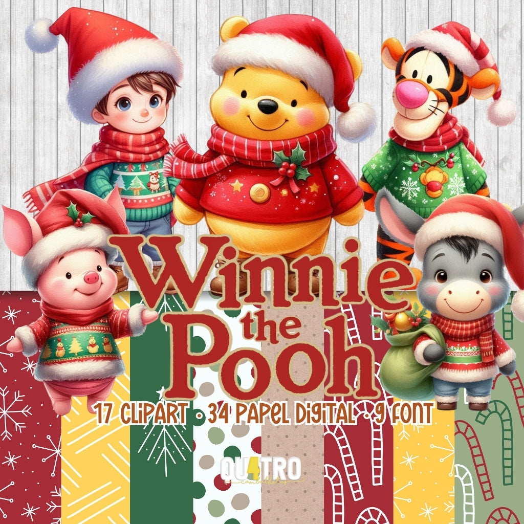 Entre no clima natalino com o adorável Kit Digital Natal Ursinho Pooh! 🎅✨ Inspirado no ursinho mais fofo do Bosque dos Cem Acres, este pacote inclui 17 cliparts exclusivos, 34 papéis digitais e 9 fontes temáticas, ideais para festas, scrapbook, convites, decoração natalina, lembrancinhas e muito mais!