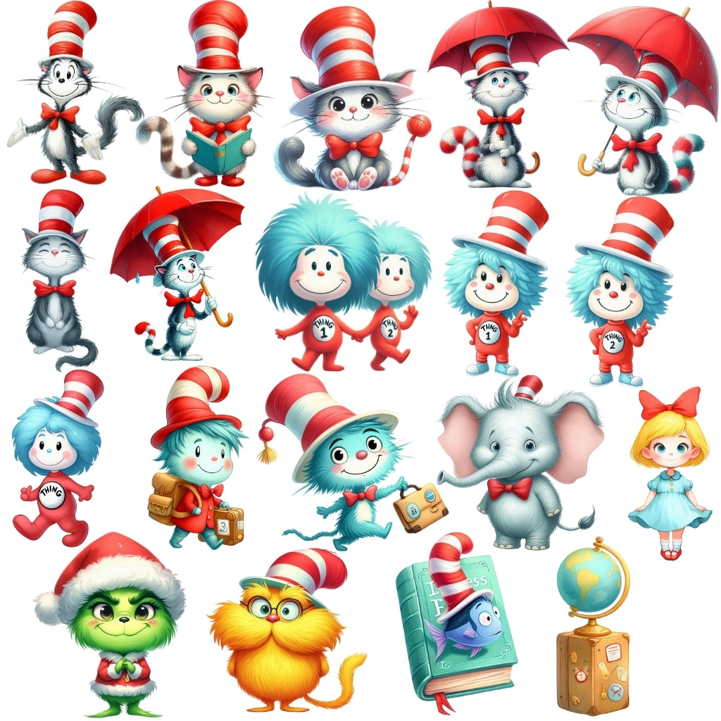 ✅ 19 Cliparts – Ilustrações exclusivas de personagens e elementos do universo Dr. Seuss (PNG, fundo transparente)