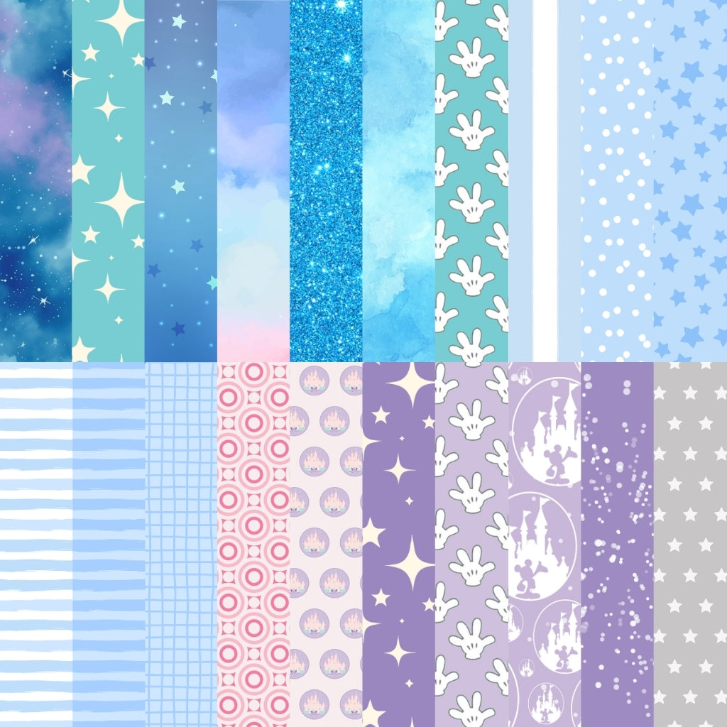 ✅ 35 Papéis Digitais com estampas inspiradas em castelos, estrelas, princesas, contos e elementos mágicos