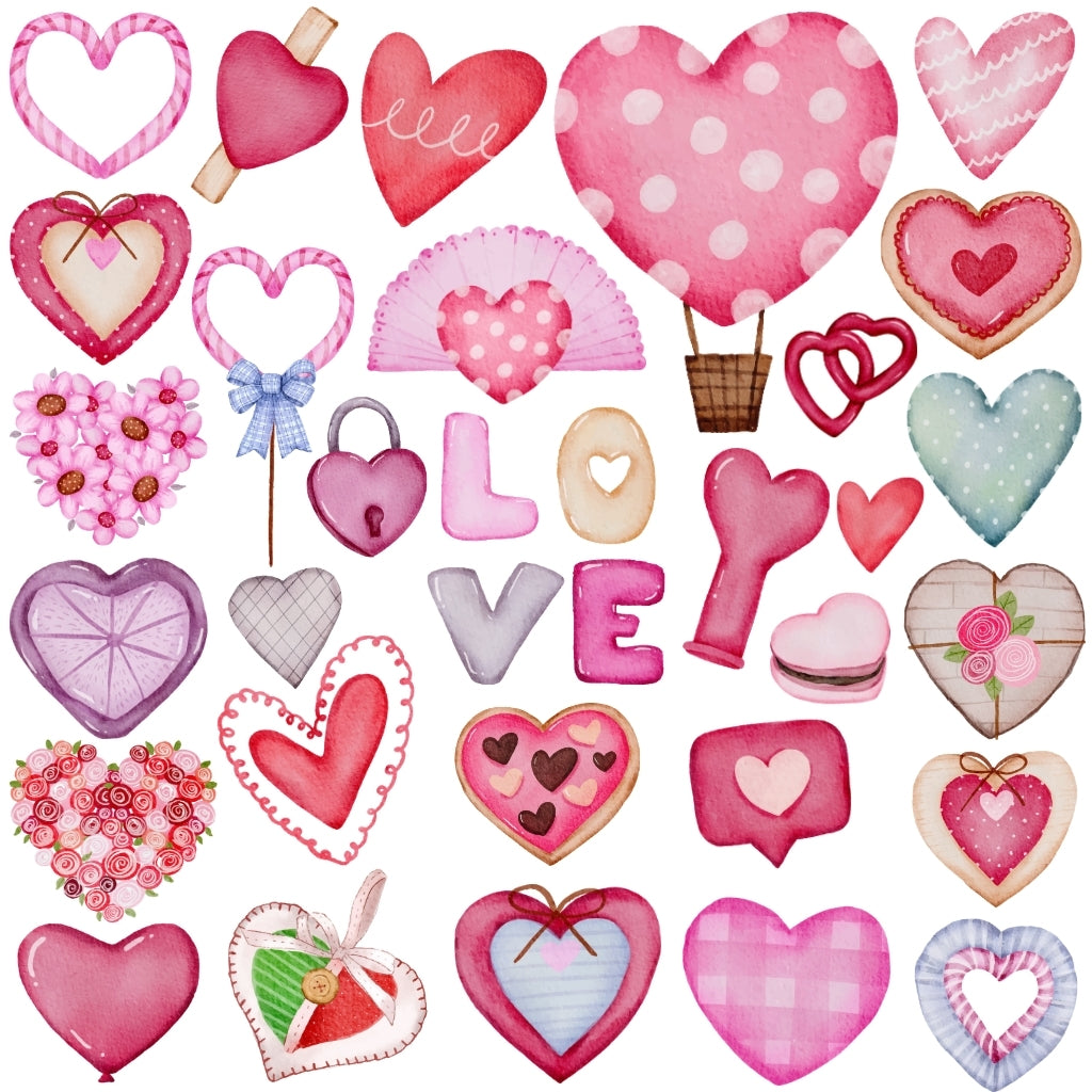 Compuesto por 30 ilustraciones exclusivas de corazones , este kit es perfecto para dar ese toque especial y pasional a tus creaciones, con mucho encanto, color y delicadeza.