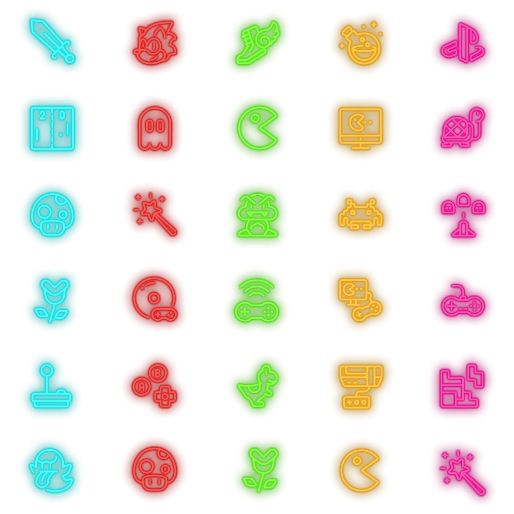 Este paquete exclusivo cuenta con 26 ilustraciones digitales con estilo neón, inspiradas en el mundo de los juegos, los arcades y la tecnología. ¡Ideal para crear arte moderno, llamativo y con mucha personalidad!