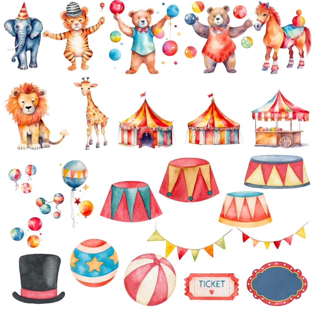 Con una paleta cálida y enérgica , el kit reúne todos los elementos que hacen del circo un universo lúdico y encantador .